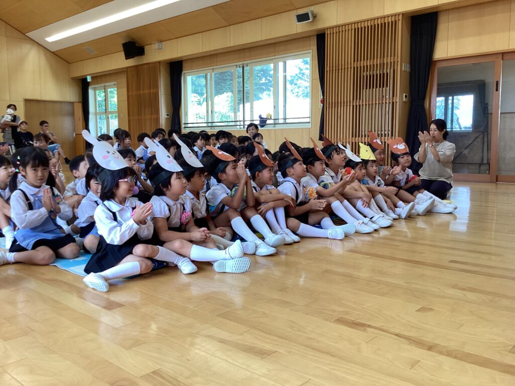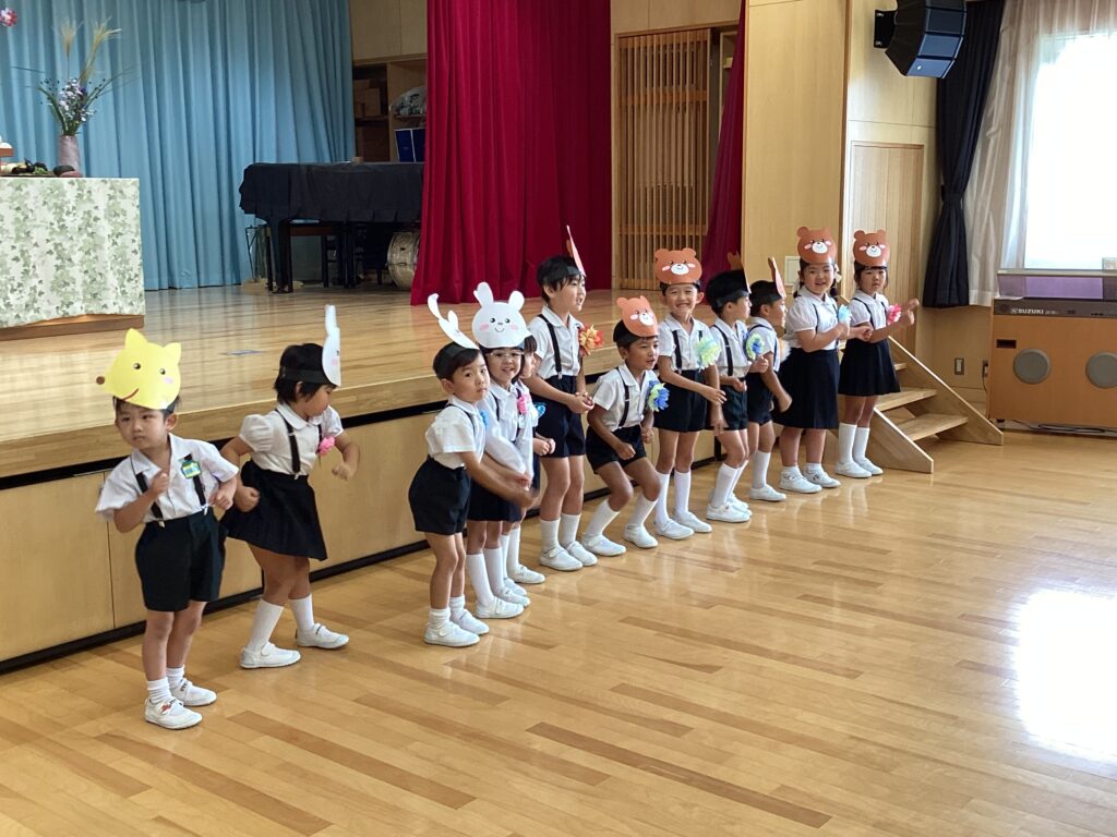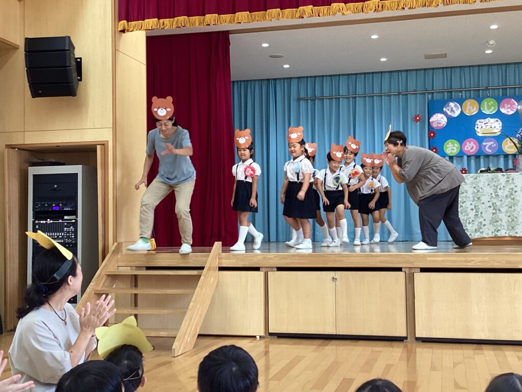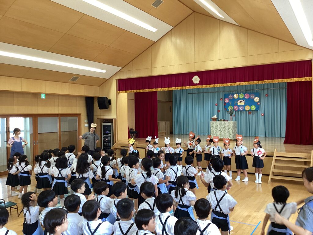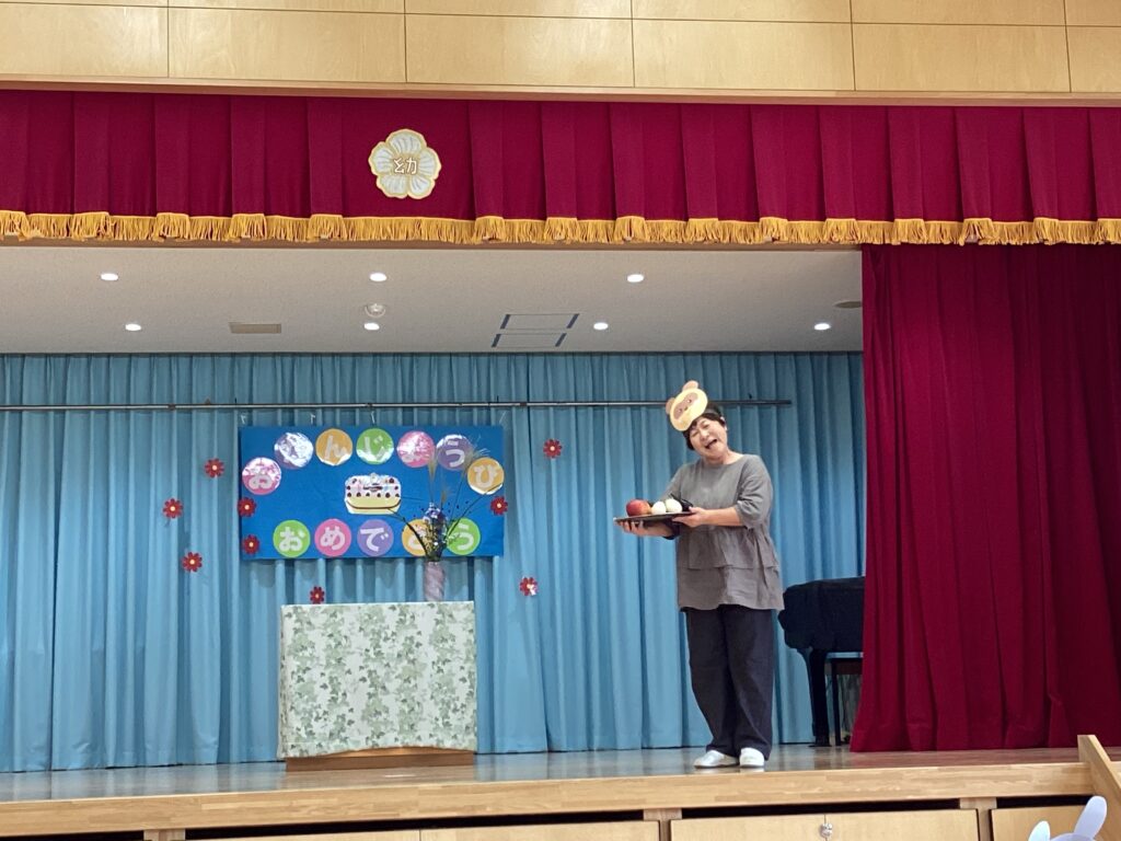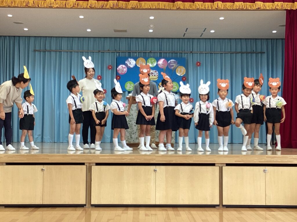今月のお楽しみは、お月見にちなんで十五夜のお話。誕生児のお友だちにもきつねやうさぎ、くまに変身して貰いました。