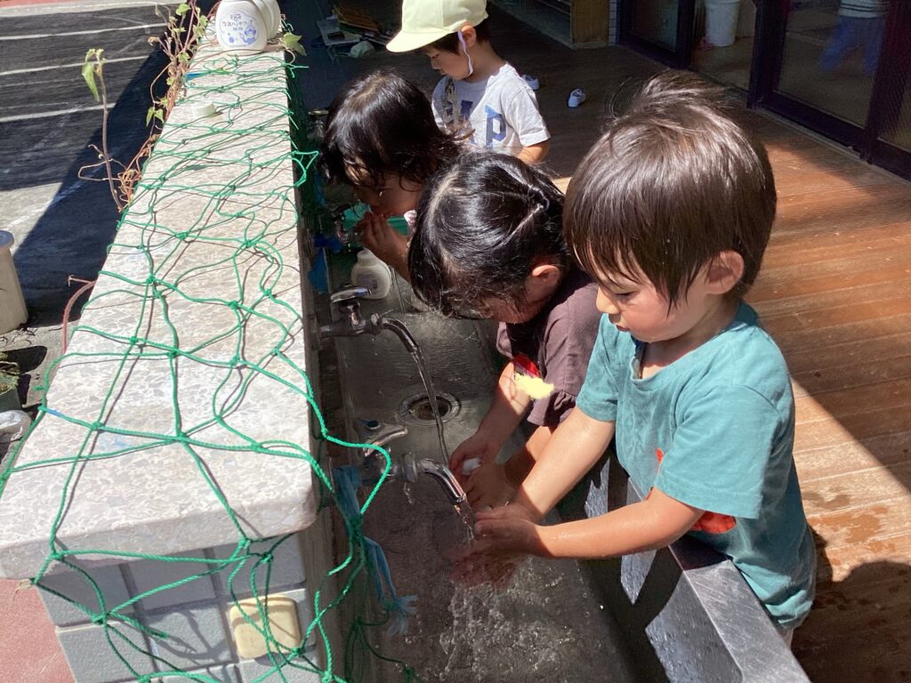 外で遊んだら手洗いもします。