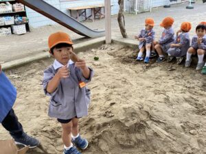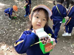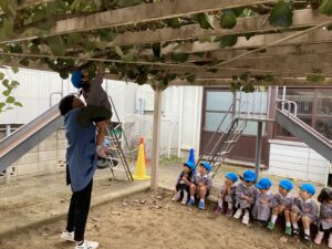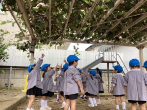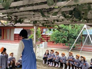 10月に入り、肌寒くなる日も増えました。そろそろ裏園庭のキウイは大きくなっているかな?     みんなで見にいくことに。。。